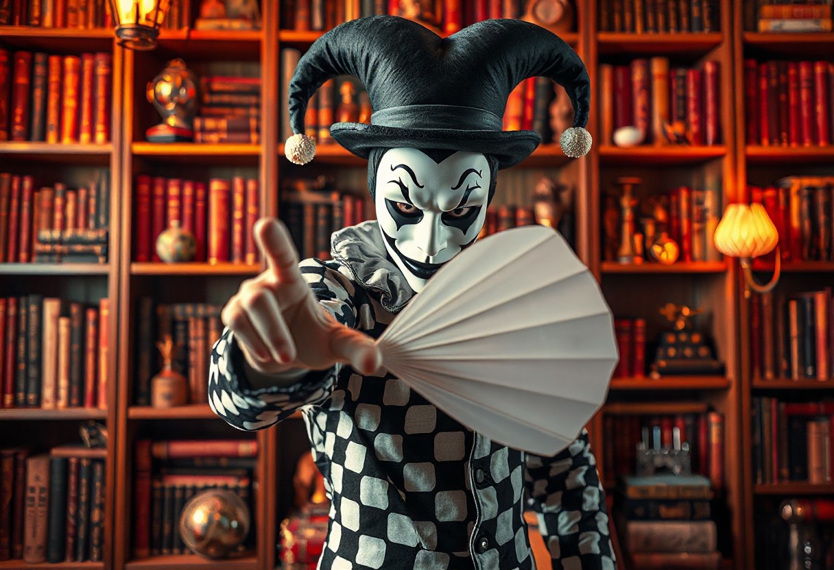 A captivating 4K image, trending on ArtStationHQ, presents a harlequin jester in a dynamic pose, their face hidden by an enigmatic white mask. The jester, central to the composition, uses the golden ratio to command attention. Clad in a meticulously detailed black and white costume—a polka-dotted top hat, striped shirt, and checkered pants—they gesture with a pristine white fan towards the viewer, creating an immediate connection. The jester's eyes, rendered with lifelike detail, convey vivid emotions. The background, a richly detailed bookshelf overflowing with books and knick-knacks, adds depth and context, suggesting a personal library or study. The style seamlessly blends Raphael's classical grace with Houdini's theatrical flair, enhanced by the vibrant energy of splash ink illustration and the photorealistic precision of an Octane render. Harmonious, multicolored tones bathe the scene in captivating light, creating a joyful impact and delivering a powerful, unspoken message. The image is rendered with Unreal Engine 5, emphasizing high-resolution details, sharp lines, stunning colors, and impeccable composition. Every element, from the super-detailed face and clothes to the intentional focus and well-timed moment, contributes to an exceptionally high-quality, handcrafted masterpiece. The overall aesthetic is contemporary, evoking a sense of wonder and mystery.