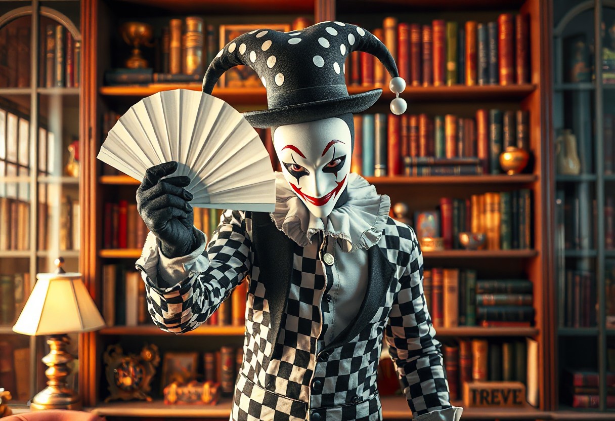 A captivating 4K image, trending on ArtStationHQ, presents a harlequin jester in a dynamic pose, their face hidden by an enigmatic white mask. The jester, central to the composition, uses the golden ratio to command attention. Clad in a meticulously detailed black and white costume—a polka-dotted top hat, striped shirt, and checkered pants—they gesture with a pristine white fan towards the viewer, creating an immediate connection. The jester's eyes, rendered with lifelike detail, convey vivid emotions. The background, a richly detailed bookshelf overflowing with books and knick-knacks, adds depth and context, suggesting a personal library or study. The style seamlessly blends Raphael's classical grace with Houdini's theatrical flair, enhanced by the vibrant energy of splash ink illustration and the photorealistic precision of an Octane render. Harmonious, multicolored tones bathe the scene in captivating light, creating a joyful impact and delivering a powerful, unspoken message. The image is rendered with Unreal Engine 5, emphasizing high-resolution details, sharp lines, stunning colors, and impeccable composition. Every element, from the super-detailed face and clothes to the intentional focus and well-timed moment, contributes to an exceptionally high-quality, handcrafted masterpiece. The overall aesthetic is contemporary, evoking a sense of wonder and mystery.