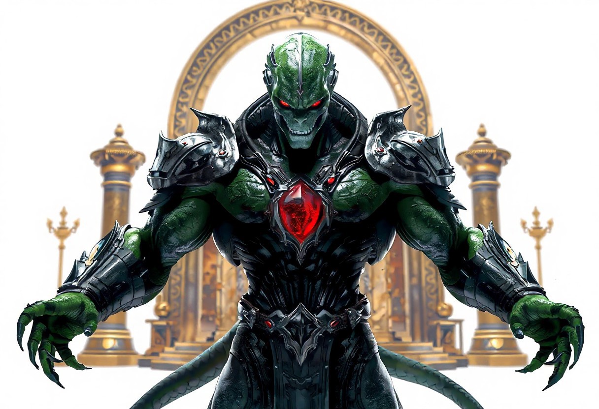 "A muscular green Lazion, a Timelord alien, stands center stage in a stark white void. Its black and silver armor clads torso and arms, glowing with a red gem on the chest that pulses with energy. The Lazion’s arms are outstretched, fingers curled as if ready to strike, while its face is rendered with super detailed eyes and a fierce expression. The background, 'Treasures of the Kings,' features a golden archway and ancient relics, contrasting with the alien’s monochrome ensemble. Lighting is dramatic, casting sharp shadows and highlighting the armor’s metallic sheen. The composition balances dynamic action with intricate design, evoking a sense of power and mystery. Style: Raphael’s fluidity meets Houdini’s precision, with a splash ink illustration texture. The image is crafted in Unreal Engine 5, ensuring lifelike details and a golden ratio layout."