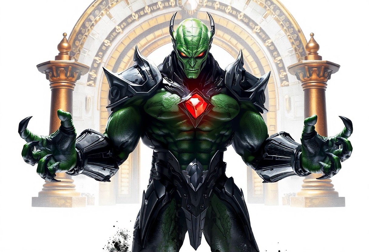 "A muscular green Lazion, a Timelord alien, stands center stage in a stark white void. Its black and silver armor clads torso and arms, glowing with a red gem on the chest that pulses with energy. The Lazion’s arms are outstretched, fingers curled as if ready to strike, while its face is rendered with super detailed eyes and a fierce expression. The background, 'Treasures of the Kings,' features a golden archway and ancient relics, contrasting with the alien’s monochrome ensemble. Lighting is dramatic, casting sharp shadows and highlighting the armor’s metallic sheen. The composition balances dynamic action with intricate design, evoking a sense of power and mystery. Style: Raphael’s fluidity meets Houdini’s precision, with a splash ink illustration texture. The image is crafted in Unreal Engine 5, ensuring lifelike details and a golden ratio layout."