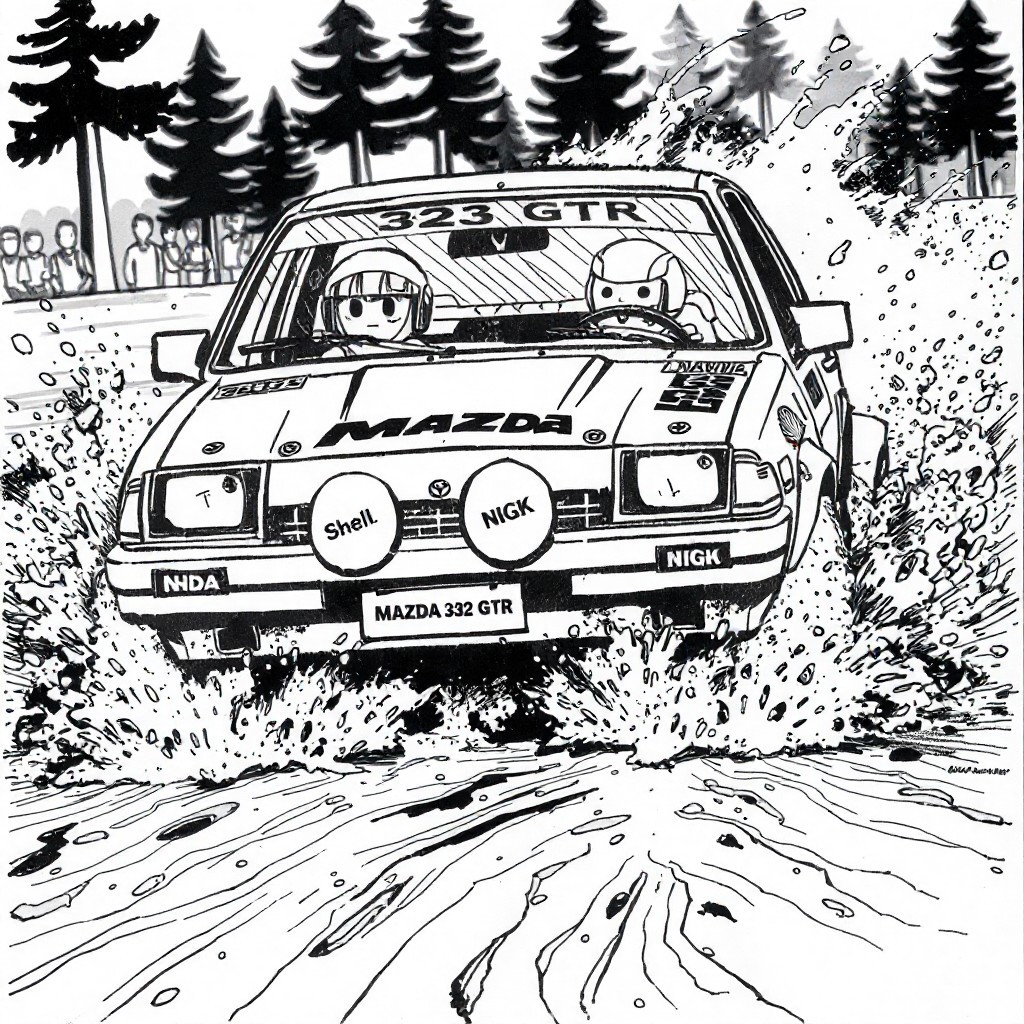 A hand-drawn, black and white sketch illustration in a dynamic comic style. The scene shows a Mazda 323 GTR rally car bursting through a muddy water crossing during an enduro competition. The car is covered in splashes of mud and water, creating chaotic and energetic motion lines around the wheels and underbody. Its headlights are on, and the front grill and bumper are partially obscured by debris. Inside the car, two cartoonish, simplified driver figures with helmets and visors are gripping the wheel and navigating the terrain with intense focus. The windshield has diagonal lines indicating speed and vibration. "MAZDA" and "GTR" decals are visible on the body, as well as a few sponsor stickers like "Shell" and "NGK", all loosely rendered. In the background, stylized trees and faint outlines of spectators blur into the distance. The overall style is exaggerated and full of motion, with bold ink lines, splash effects, and strong contrasts, reminiscent of a linocut print or a motorsports-themed zine comic. The drawing should evoke a sense of speed, chaos, and vintage rally charm from the 80s and 90s.