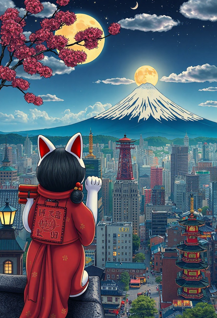 japanese city beautiful landscape, noon, woman, very intricate, very detailed, sharp, bright, colorful, mt fuji, tokyo, maneki neko watching from the roof of a building,