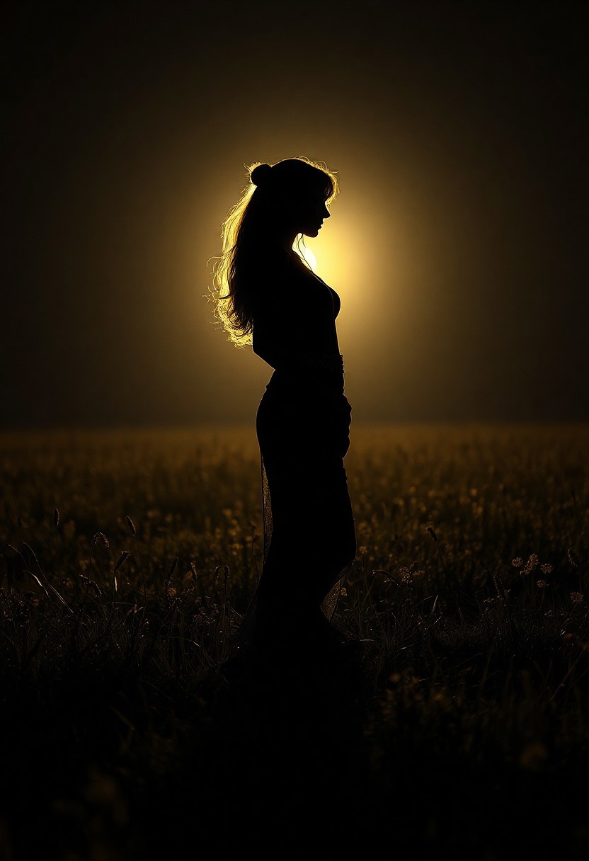 Beautiful woman silhouette on a dark luminescent meadow, shadow art, photorealistic concept art, cinematic lighting, soft natural volumetric effects. 8K UHD, high detail, intricate design, octane render. Radiating irresistible charm, perfect composition. Alluring, delicate details. High-quality masterpiece. Trending on Artstation.