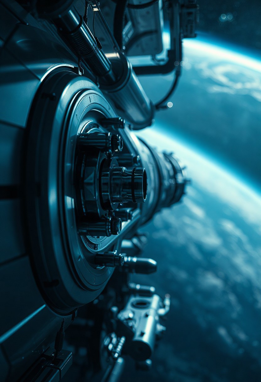 Realistic cinematic scene in 4K resolution of a modern space station docking, close-up of docking glands, hydraulic mechanisms, and connector tubes, soft reflections on metallic surfaces, subtle ambient lighting, cold blue and grey color tones, melancholic and nostalgic atmosphere, Earth visible in the background, light fog and particles in space, highly detailed, photorealistic, cinematic lens effects, shallow depth of field, modern sci-fi style, sharp focus