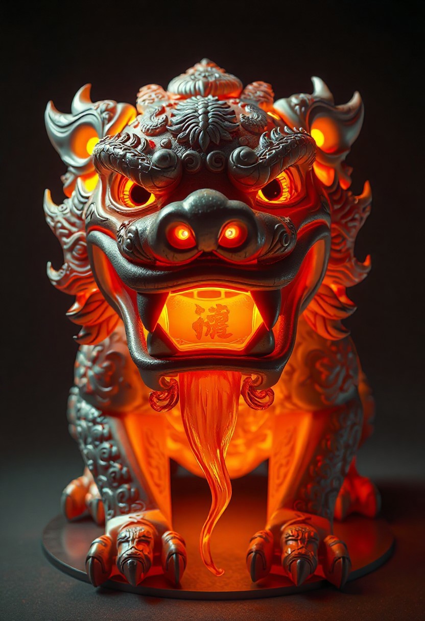 masterpiece, best quality, amazing quality, very aesthetic, high resolution, ultra-detailed, absurdres, newest, photorealistic details, volumetric lighting, foo dog with a spherical head and no body, large gapping maw, subsurface, glowing with inner light, many small teeth, large canines, drooling, complex engravings