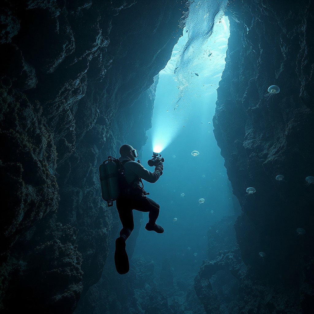 *"A breathtaking deep-sea abyss scene, with two massive rocky walls covered in bioluminescent coral and strange underwater flora. The camera angle is positioned above the diver, looking down as he explores the dark depths. The diver, wearing a high-tech deep-sea suit with glowing blue accents, holds a rugged underwater camera in one hand, filming the mysterious abyss. In his other hand, he grips a powerful flashlight, its bright beam cutting through the inky darkness, revealing eerie shadows and ancient ruins scattered along the ocean floor. Schools of alien-like fish dart away from the light, while strange, translucent jellyfish float in the distance. The water is thick with particles, creating a dreamy, cinematic atmosphere. The scene is dark, moody, and mysterious, with dramatic lighting from the diver’s flashlight casting long, haunting shadows. Ultra-detailed, photorealistic, 8K, cinematic underwater shot."*