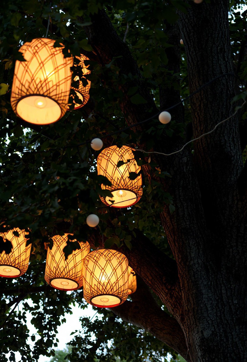 A low-angle shot captures a cluster of illuminated, geometric paper lanterns hanging from the sturdy branches of a mature tree. The lanterns are primarily cylindrical with rounded tops and bottoms, featuring a repeating pattern of radiating lines in warm orange and white hues. The light emanating from within casts a soft glow on their surfaces, highlighting the texture of the paper and the intricate design. Some lanterns appear partially obscured by the dense green foliage of the tree, creating a sense of depth and layering within the frame. The leaves are varied in shape and size, suggesting different types of foliage intertwined. A few smaller, spherical white lights are also visible, strung along a dark cord that weaves through the branches alongside the lanterns. The bark of the tree is rough and textured, with visible knots and variations in color. The overall lighting suggests either dusk or dawn, with a soft, natural light filtering through the leaves and illuminating the scene. The focus is sharpest on the central lanterns, gradually softening towards the edges of the frame, drawing the viewer's eye to the illuminated focal point. The scene evokes a feeling of warmth, tranquility, and perhaps a festive or decorative outdoor setting.