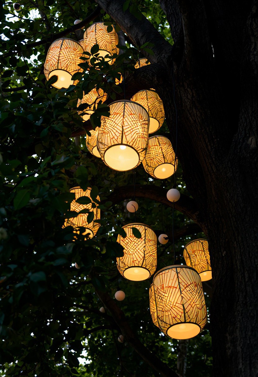 A low-angle shot captures a cluster of illuminated, geometric paper lanterns hanging from the sturdy branches of a mature tree. The lanterns are primarily cylindrical with rounded tops and bottoms, featuring a repeating pattern of radiating lines in warm orange and white hues. The light emanating from within casts a soft glow on their surfaces, highlighting the texture of the paper and the intricate design. Some lanterns appear partially obscured by the dense green foliage of the tree, creating a sense of depth and layering within the frame. The leaves are varied in shape and size, suggesting different types of foliage intertwined. A few smaller, spherical white lights are also visible, strung along a dark cord that weaves through the branches alongside the lanterns. The bark of the tree is rough and textured, with visible knots and variations in color. The overall lighting suggests either dusk or dawn, with a soft, natural light filtering through the leaves and illuminating the scene. The focus is sharpest on the central lanterns, gradually softening towards the edges of the frame, drawing the viewer's eye to the illuminated focal point. The scene evokes a feeling of warmth, tranquility, and perhaps a festive or decorative outdoor setting.