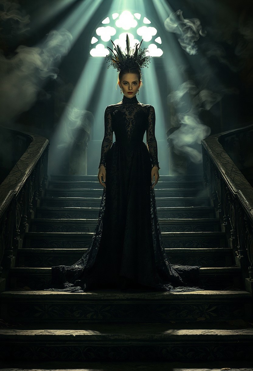 A woman with an air of regality and slight menace stands on the steps leading to what appears as if it were once a grand, opulent manor house now in decay. The setting is shrouded by thick swirling mist that seems almost alive—like remnants from another time. Her black lace gown flows dramatically around her form—as though caught between light and shadow—a single beam of dramatic lighting filters through an arched window above casting long shadows on the stone steps with intricate gothic carvings. She wears a complex headpiece adorned in dark velvet that enhances both beauty and unsettling presence. This image is inspired by Kentaro Miura’s visual storytelling—both elegant yet haunting—with cinematic depth, high detail rendering at 8k resolution*