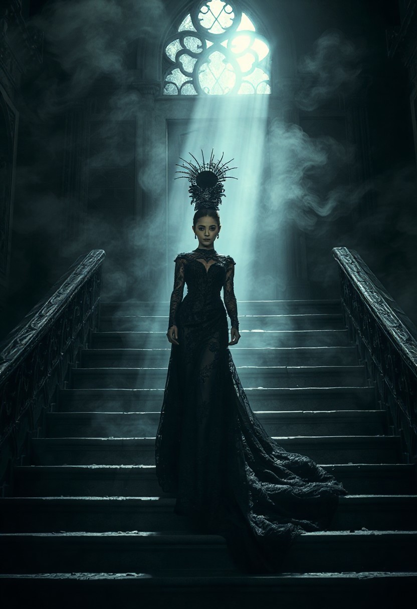 A woman with an air of regality and slight menace stands on the steps leading to what appears as if it were once a grand, opulent manor house now in decay. The setting is shrouded by thick swirling mist that seems almost alive—like remnants from another time. Her black lace gown flows dramatically around her form—as though caught between light and shadow—a single beam of dramatic lighting filters through an arched window above casting long shadows on the stone steps with intricate gothic carvings. She wears a complex headpiece adorned in dark velvet that enhances both beauty and unsettling presence. This image is inspired by Kentaro Miura’s visual storytelling—both elegant yet haunting—with cinematic depth, high detail rendering at 8k resolution*