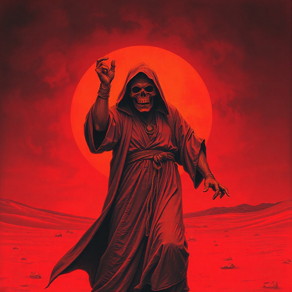 Dark art a cloaked ominous monk from the 70s-style pulp painting, standing in a psychedelic red desert dancing his ass off, his jaw is grotesquely wide open, The sky is red and otherworldy. Duotone: Burnt orange and deep plum. Mood: Occult ritual meets 80's crinkled concert poster art style. Grim reaper, doom metal-style, gritty, desert ritual, screamo