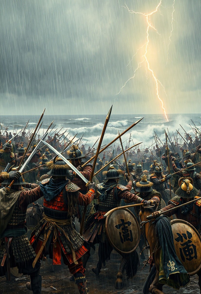 A vivid, cinematic battle on a stormy coastal plain, showing adult Japanese samurai clashing with adult Mongolian warriors in a 13th-century conflict. Rain lashes the scene as warriors engage in intense combat, with ocean waves crashing and distant ranks fading into mist. The atmosphere is chaotic and richly detailed. Japanese Samurai: Elite samurai, all mature warriors, wield katana and naginata, blades gleaming. Ashigaru spearmen, also adults, form disciplined ranks with yari spears. Samurai wear o-yoroi armor: lacquered iron plates in crimson and black, tied with silk cords, paired with kabuto helmets featuring gold crests and protective menpo masks. Ashigaru wear simpler do-maru armor in muted greens. Tate shields display white clan mon. Weapons include tachi swords, tanto daggers, and yumi bows. Colors are crimson, black, and gold, with blue-white silk sashes billowing. Mongolian Warriors: Adult Mongol horse archers fire composite bows, while infantry brandish curved sabers and maces. They wear lamellar armor of iron and leather in browns and blues, with conical helmets topped with horsehair plumes. Round shields bear red-black tribal patterns. Cavalry wear fur-lined vests and felt boots. Weapons include short spears and handaxes. Colors are brown, blue, and red, with embroidered saddlecloths. Stormy skies and lightning highlight wet armor. Mud and battle scars add realism.