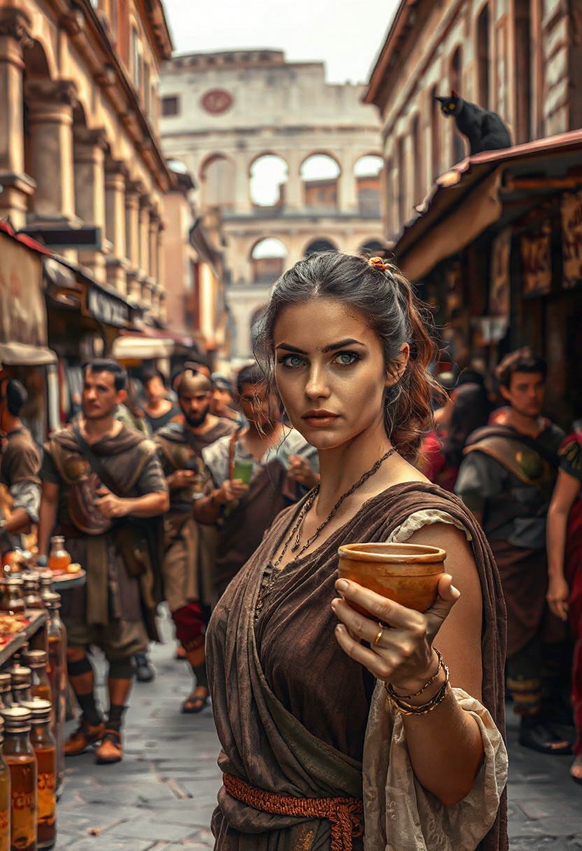 Setting is a 1st century Roman Empire market in Rome, the market is comprised of street vendors selling, food, weapons, and clothing. Everyone and everything in the image is appropriate for a scene from Ancient Rome, People wearing Roman clothing are walking through the crowded chaotic street market shopping and eating, in the foreground is a merchant selling beverages and food at a market kiosk, (((a beautiful woman, 24 years old is standing in the foreground, the woman facing the viewer with a clay goblet of wine in her hand. Her eyes are beautiful and focused on the viewer, she has an expression of interested curiosity))), Roman Soldiers are walking behind the beautiful woman, one of the solders turns to look at the beautiful woman, many people are walking by in the busy street market, the woman is dressed in high fashion Roman Empire clothing with an alluringly sexual, but traditional roman aesthetic. The woman's hair is elegantly tied up with a ribbon. Artistic ancient Roman aesthetic, dynamic perspective, (((overall architectural aesthetic is Ancient Rome in 1st Century Roman Empire era))). Epic image that elicits a feeling of wonder and awe, Rome Coliseum Roman Forum architecture in background, a sleek black cat is visible sitting on a kiosk roof in the background,