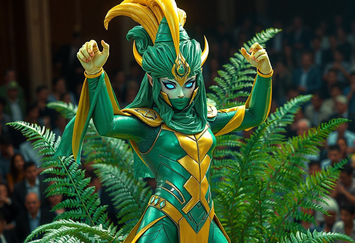 The Sage with Eyes of Blue cosplay features a meticulously crafted costume combining vibrant emerald green and golden yellow panels. The headpiece consists of a 3-foot-tall conical structure with iridescent green fabric cascading down one side, complemented by a smaller, stylized yellow horn curving from the temple. The body suit incorporates geometric patterns with contrasting panels, creating a futuristic yet organic aesthetic. In the isometric composition, the character strikes a dynamic action pose with one arm raised in a defensive stance while standing before a stylized fern plant. The Unreal Engine 5 rendering captures every brush stroke of the Octane Rendered textures, particularly the detailed eye patterns and the layered headpiece. Grammer Effect lighting emphasizes the character's blue irises while creating dramatic shadows on the Houdini-style costume folds. The scene follows the Golden Ratio for composition balance, with the crowd in the background adding context to the Performapal Dramatic Theater setting. This 4K quality image demonstrates Raphael-style character design principles with its harmonious color palette and powerful emotional impact.