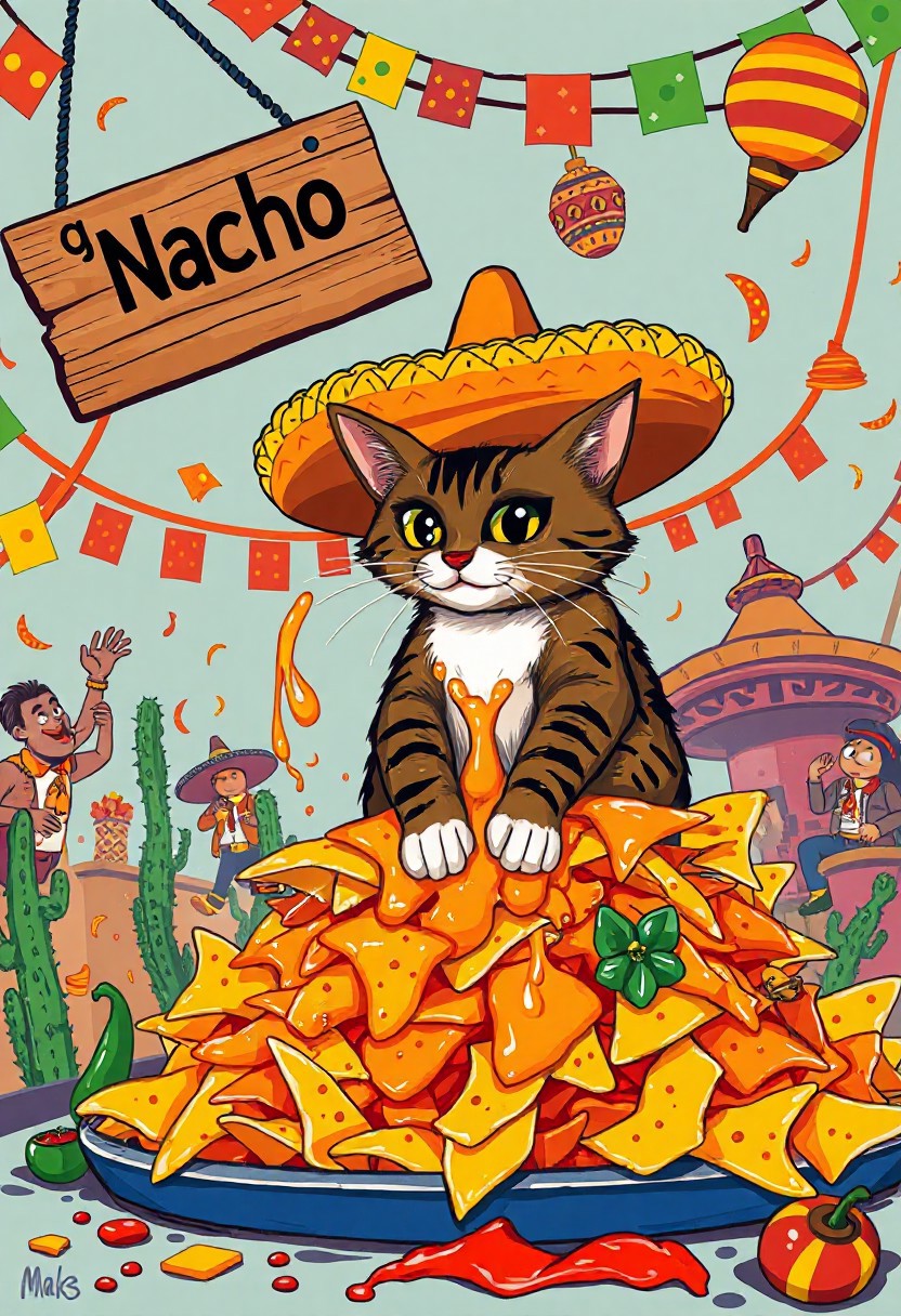 Vector flat Mexican style art Poster, A mischievous tabby cat wearing an oversized, brightly colored sombrero adorned with tiny chili pepper ornaments sits triumphantly atop a towering mountain of cheesy nachos. The chips buckle under neon-orange melted cheese that oozes like lava. The cat, with sparkling anime-style eyes the size of tortillas, swipes a nacho with dramatic flair, flinging cheese onto its whiskers in a gooey mess that stretches cartoonishly as it frantically licks it off. Behind the chaos, a vibrant Mexican fiesta bursts to life papel picado streamers flutter in reds, greens, and yellows, while googly-eyed piñatas shaped like cacti and mariachi figures dance and cheer. A hand-painted wooden sign reading “¡Nacho Gato!” swings crookedly above, caught in the festive whirlwind. Scattered below are salsa spills, a runaway jalapeño, and a toppled maraca. Rendered in a vivid Mexican folk-art style with bold outlines and Talavera-inspired patterns, the scene pops with fiery reds, sunny yellows, and deep azules—perfectly capturing the wildly whimsical spirit of a feline fiesta gone hilariously off the rails.
