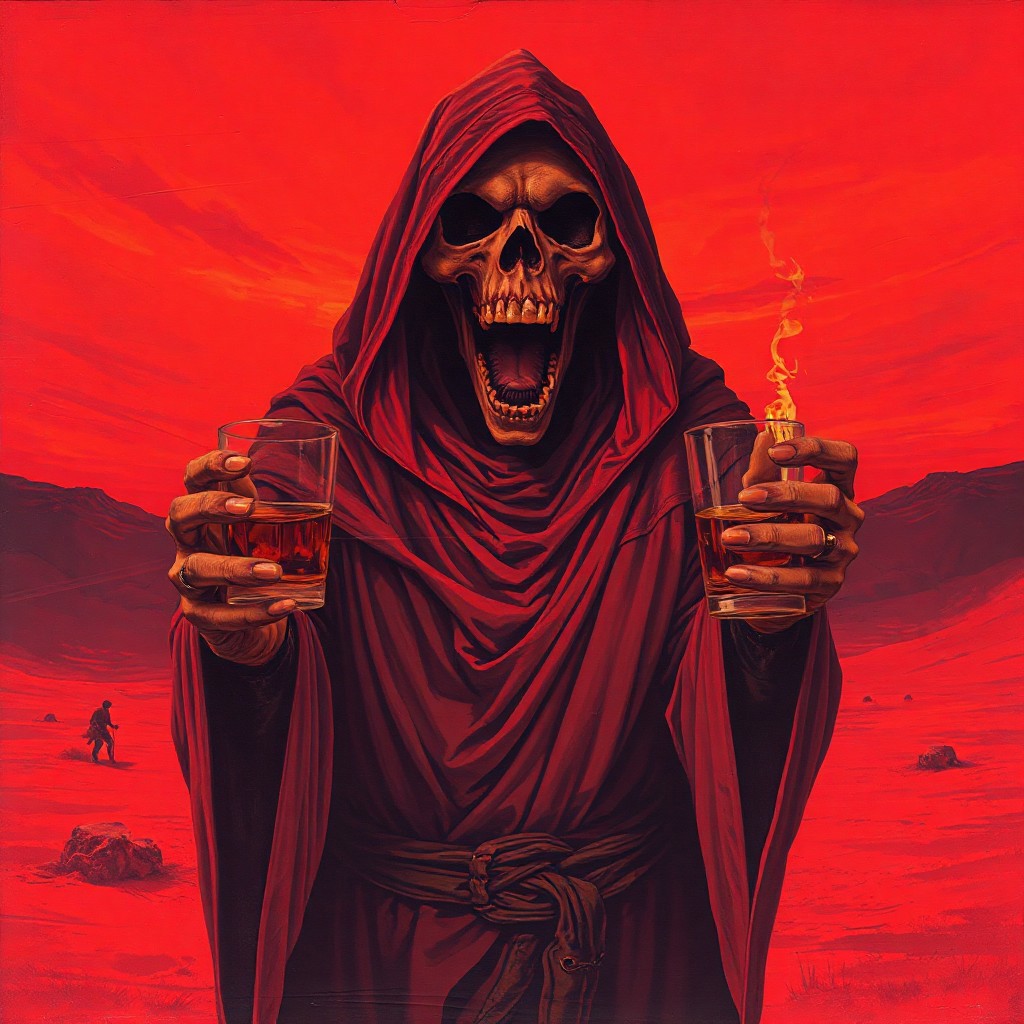 Dark art depicting a cloaked ominous monk from the 70s-style pulp painting, standing in a psychedelic red desert clutching a glass of whiskey screaming agressively with a twisted expression on his skeletal face, his jaw is grotesquely wide open, The sky is red and otherworldy. Duotone: Burnt orange and deep plum. Mood: Occult ritual meets 80's crinkled concert poster art style. Grim reaper, doom metal-style, gritty, desert ritual, screamo