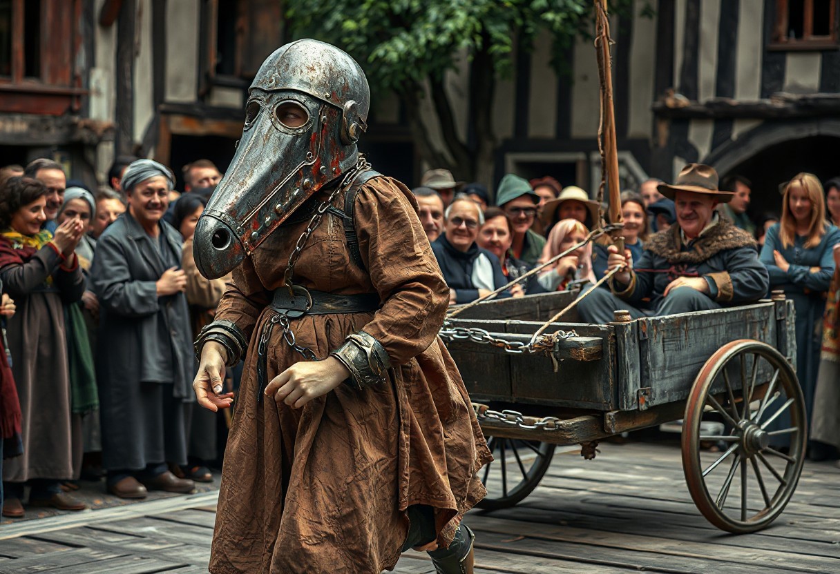 overall wide-angle full height standing view from a distance of 20 metres, in the style of A Handmaid's Tale, a women captive with a very long neck, (she has heavy polished steel manacles around both wrists that are linked together with a heavy chain, she has polished steel leg-irons around each ankle that are linked with a heavy chain:1.7), (she is wearing a polished steel casing around her torso and shoulders, the casing is chained to the wooden post:1.8) an unruly crowd is laughing at her, on a wooden platform at a Renfaire in a mock medieval town square, she is wearing a medieval close-fitting full face rusty iron bridle in the form of a female head, there are many cut outs and ornately decorative slits and slots in the bridle, the bridle closed in over her face and mouth and eyes, it fits closely to her head and neck like a second skin fully enclosing head and face and neck, the head bridle has two projecting tubular eyeholes and the iron neck casing is very tall and there is an iron drinking tube coming from the iron panel covering her mouth and iron funnels emanate from her ears, the bridle is fastened with a padlock at the back of her head, (she is wearing a ragged medieval dress and she is harnessed to a small wooden cart which she is pulling like a human pony:2.0), (a pretentious lord is sitting in the cart and is wielding a whip at her:2.0)