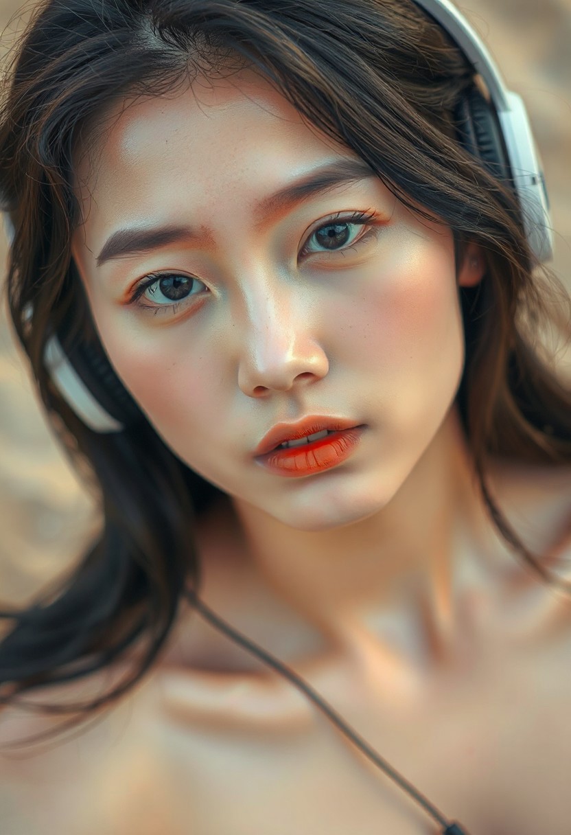 DSLR-style, glamorous and elegant 26-year-old Korean model, extremely milky white skin with porcelain glow, smooth and luminous, flawless soft matte finish with light reflecting quality, Korean idol skin tone, subtle gradient from center to jawline, extremely pale white skin, parted lips, barely visible pores, uniform soft tone, studio-lit skin, full body, deep cleavage, extremely cleavage breasts. A captures a young individual with fair skin and subtle rosy cheeks, gazing directly at the viewer with a neutral yet engaging expression. Their dark, slightly wavy hair frames a face with delicate features, including a small, defined nose and full, natural lips. Soft, diffused lighting illuminates their face, highlighting the gentle curve of their jawline and the subtle texture of their skin. The individual has dark eyes with a hint of warmth in their tone. They are wearing headphones that rest over their ears, The background is softly blurred, hinting at an outdoor setting with muted, earthy tones of beige and brown, possibly suggesting sand or a natural, sun-drenched environment. The overall mood is serene and contemplative, focusing on the subject's calm presence and direct gaze. The style evokes a feeling of natural beauty and quiet introspection. The lighting suggests either soft daylight or a carefully controlled studio setup mimicking natural light. The focus is sharp on the subject's face, with a shallow depth of field drawing attention to their features and expression.