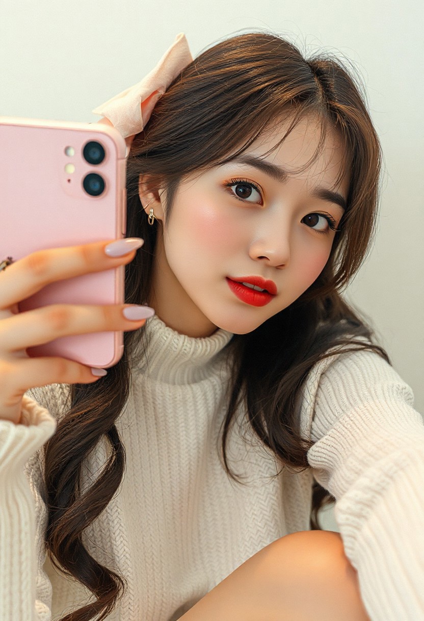 DSLR-style, glamorous and elegant 26-year-old Korean model, extremely milky white skin with porcelain glow, smooth and luminous, flawless soft matte finish with light reflecting quality, Korean idol skin tone, subtle gradient from center to jawline, extremely pale white skin, parted lips, masterpiece, ultra high-resolution <lora:NOOB_vp1_detailer_by_volnovik_v1:1> barely visible pores, uniform soft tone, studio-lit skin, full body 21yo pretty korean model, amateur selfie, tight and firm body, tight short dress, long socks, Best quality, realistic, Looking at the camera, fresh face, beautiful dark eyes, long eyelashes, high prominent cheekbones, olive skin, flirting, wavy brown hair, full lips, slim and petite, very detailed, ((shiny skin)), futa, bulge, oversized sweater, big pastel pink bow at the back of the head, dynamic pose, high white socks, sitting, take a selfie with a pastel pink phone,masterpiece, best quality, newest, absurdres, highres, anime, anime style, curled-toes-IL.V1.0, toe scrunch, curled toes soles, 1girl, Nico robin/(one piece/), black hair
