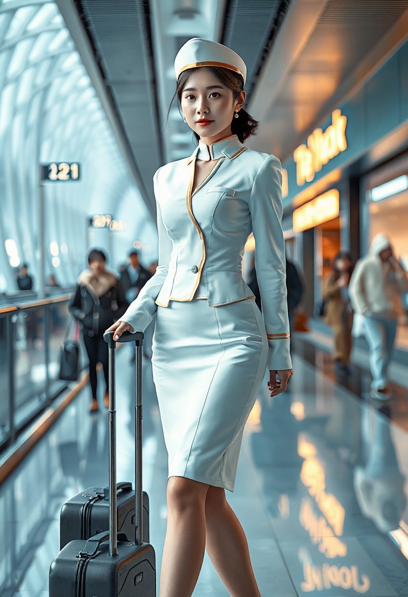 DSLR-style, glamorous and elegant 26-year-old Korean woman with flawless pale skin and natural glow. Subtle facial features, parted lips, soft expression. Masterpiece, ultra high-res. <lora:NOOB_vp1_detailer_by_volnovik_v1:1> realistic skin texture with visible pores under soft lighting, porcelain-like translucency, full body composition. She is wearing a form-fitting white uniform reminiscent of a high-class airline crew, featuring gold-trimmed cuffs and a tailored short skirt that highlights long legs. A matching peaked cap rests neatly on her styled hair. Her blouse is sharply cut with a deep neckline, subtly suggesting curves underneath. The setting is a sleek, modern airport terminal or luxury shopping mall. Reflections bounce off the translucent flooring beneath her feet, revealing faint outlines of the level below. A premium-looking rolling suitcase stands beside her, reinforcing the impression of poised mobility. In the background, casually dressed passersby move through the brightly lit space — one in a dark jacket and jeans, another in a cream-colored hoodie and pants. Illuminated signage with numbers and the glowing brand logo of a tea shop add urban context. Capture the visual tension between stillness and motion, elegance and suggestion. Focus on textile texture, fabric tension, floor reflection, and ambient light realism.