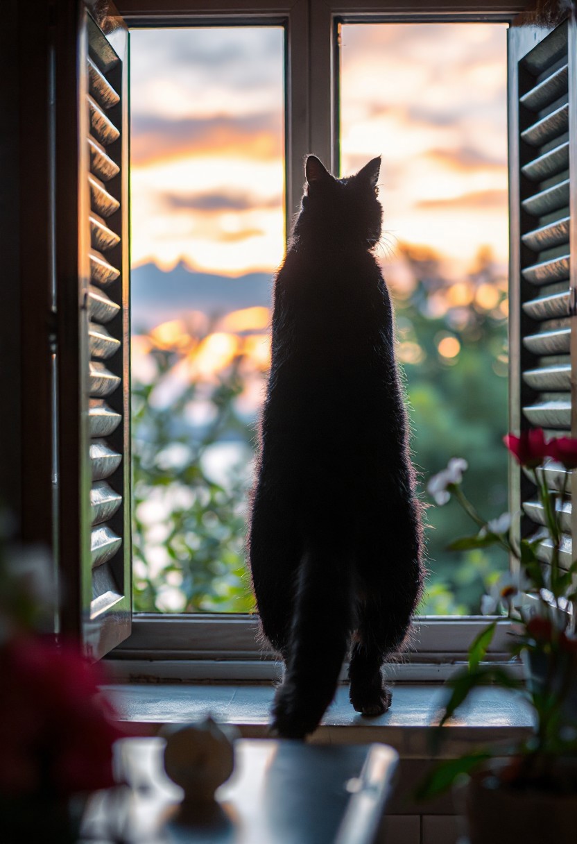 (Soft Lighting Photography by Mimoza Veliu and Mario Giacomelli:1.2), a cat perches on a windowsill at dusk. The feline, with its black fur and striking eyes, sits majestically in profile view, gazing out of the window with an expression of contemplation. The sky outside is painted with hues of orange and purple, suggesting the setting sun. The window, framed by wooden shutters, offers a view of lush greenery under the fading light of day. The cat's position on the windowsill provides a vantage point overlooking plants that seem to be in full bloom. The room is softly illuminated by the ambient light from the window, casting gentle shadows around the space. The overall atmosphere is one of tranquility and introspection, as if time has momentarily paused for this serene scene., solo, sitting, standing, tail, closed eyes, flower, outdoors, sky, day, cloud, indoors, water, from behind, blurry, tree, blue sky, no humans, window, animal, leaf, sunlight, cat, cloudy sky, plant, white flower, red flower, scenery, desk, backlighting, reflection, sunset, sun, facing away, potted plant, black cat, animal focus, twilight, evening, whiskers, gradient sky, orange sky, black fur, dusk, daisy, open window, looking outside, windowsill