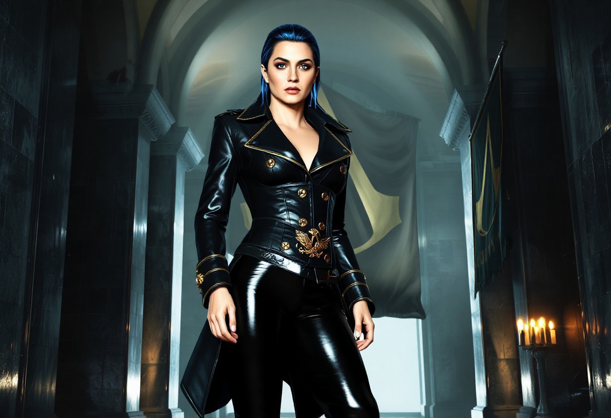 A striking female assassin stands confidently in a dimly lit, opulent alcove. Her tailored high-collar latex coat is cut like a noble uniform—flared at the waist into a sharp, regal tail, cinched tightly by a black belt adorned with a gold Assassin's eagle emblem. Beneath the coat, a gloss-black underbust corset defines her hourglass figure, paired with a structured rubber bodysuit that reflects the ambient light in shimmering curves. Her legs are encased in gleaming thigh-high latex heeled boots, detailed with subtle gold piping that echoes the insignia on her belt. Her face is revealed—sharp cheekbones, a beauty mark beneath her left eye, vivid lightning-blue streaks running through sleek, side-swept hair. Her makeup is pristine: dark eyeliner, rouge lips, and arched brows that hint at mischief and authority. Behind her, a forgotten sanctuary: gothic arches stretch overhead, walls of matte black stone inlaid with mirrored laminate panels. Floating dust catches warm golden candlelight. A tattered Assassin’s banner hangs on one pillar—embroidered in gold thread, aged but proud. The whole chamber hums with reverence and resistance, echoing her presence.