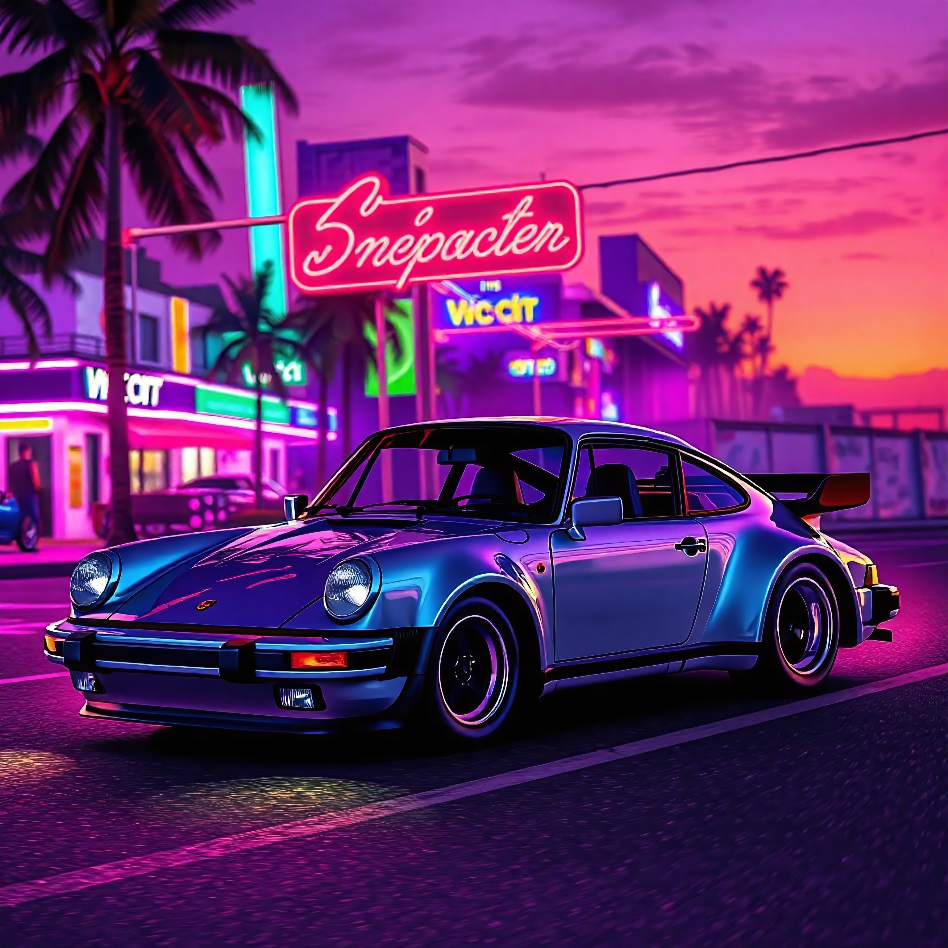 Create a 80's themed vibe of a classic Porsche 911 turbo driving through the vice city stip with a lot of neon lights, very colorful and a beach on the other side, Purple lights, pink lights, green lights, blue lights,
