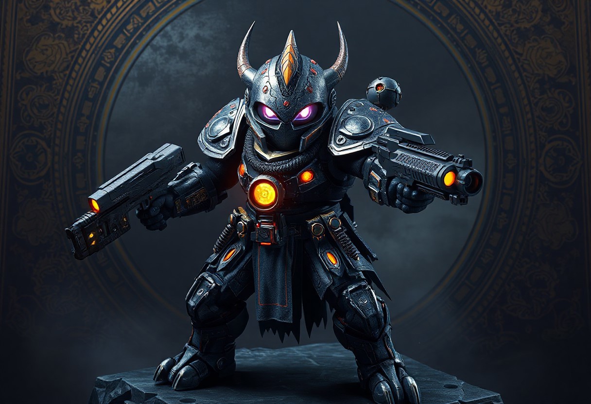 "Imagine a hyper-detailed 8K digital artwork of a Stardust Assault Warrior, rendered in Unreal Engine 5 with Octane lighting. The warrior stands in a dynamic isometric pose, arms and legs spread wide, gripping a massive gun on the right and a compact one on the left. Its face is illuminated with vibrant, expressive eyes, while its clothing shimmers with intricate, handcrafted textures. The background is a moody, ornate matte painting, balanced with golden ratio proportions, and the scene is framed for cinematic impact. The composition emphasizes sharp focus, vivid emotions, and a powerful, action-ready atmosphere."