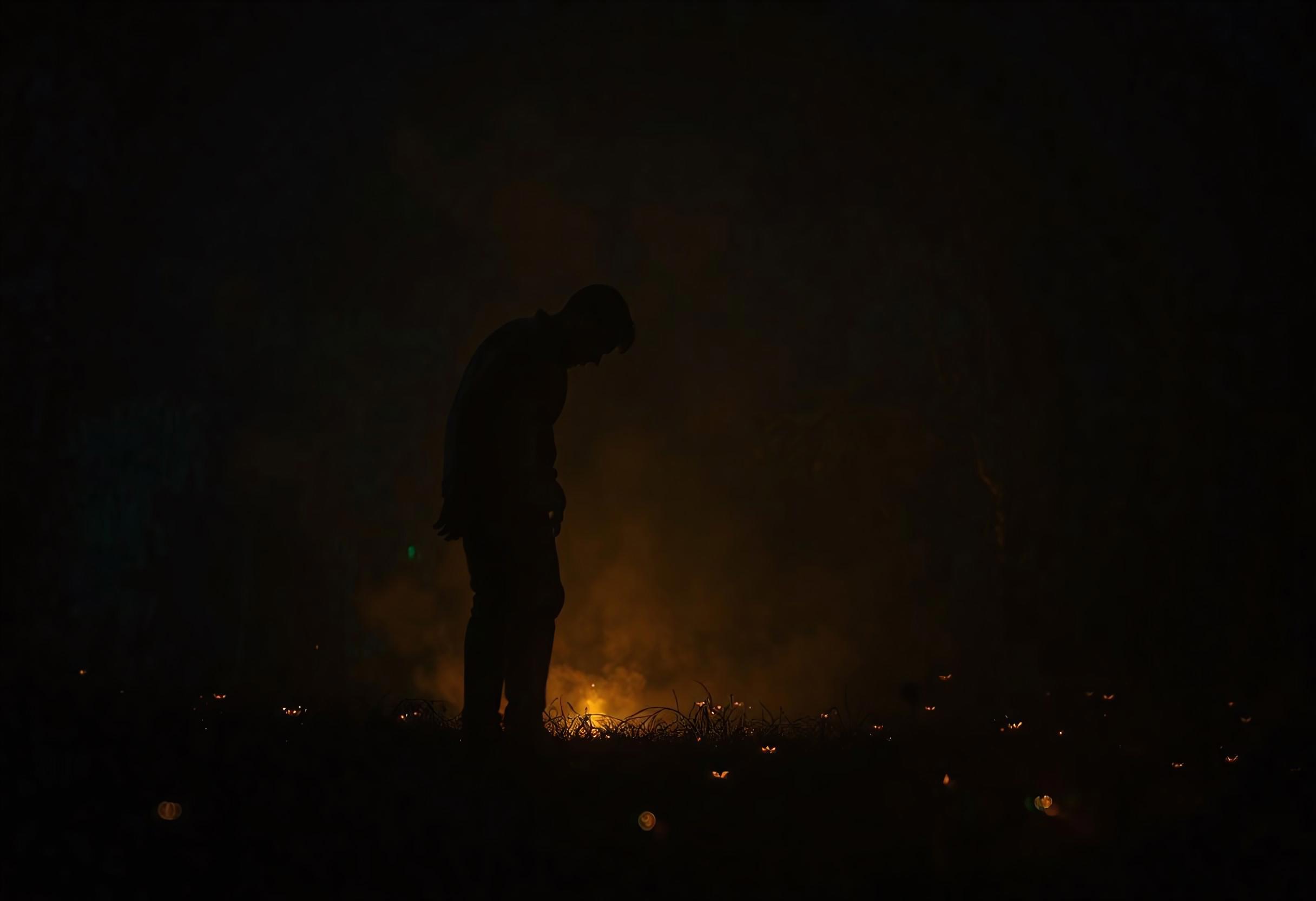 a dark horror scene, in the foreground mister burns from the simsons leaning other a peron on the ground, silhouette, dwarfed by a dark jungle in the background, tiny dot like glowing insects, ultra detailed, dimm unreal dark night, mix of documentary and splater horror. fine soft fog, dim warm glow, enpowering the contrast of the low angle shot, 2 scary looking eyes in the dark jungle,. Shot with a full-frame DSLR, 85mm lens at f/1.8 for shallow depth of field, ISO 400, 1/100 shutter speed. Natural light enhanced with slight post-processing contrast boost and dramatic tone grading. balancing organic beaty with macabre cartoon,