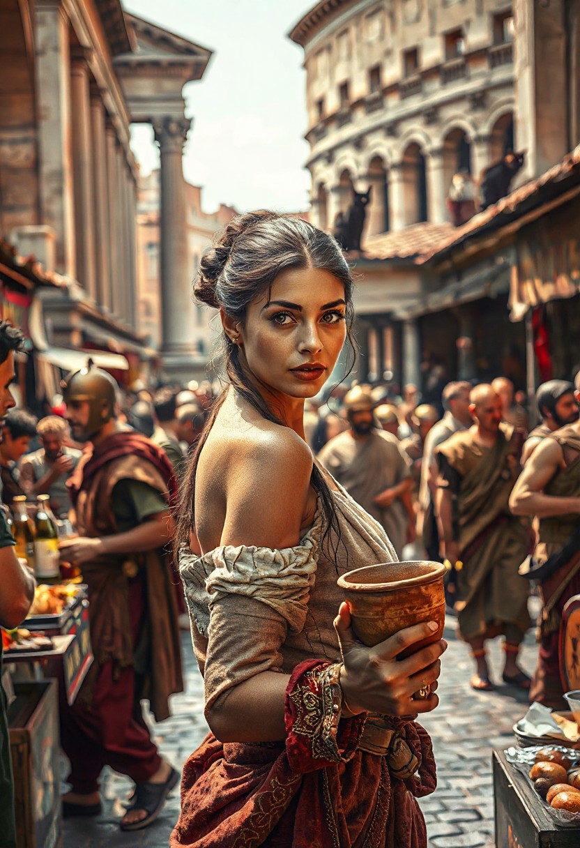 Setting is a 1st century Roman Empire market in Rome, the market is comprised of street vendors selling, food, weapons, and clothing. Everyone and everything in the image is appropriate for a scene from Ancient Rome, People wearing Roman clothing are walking through the crowded chaotic street market shopping and eating, in the foreground is a merchant selling beverages and food at a market kiosk, (((a beautiful woman, 24 years old is standing in the foreground, the woman facing the viewer with a clay goblet of wine in her hand. Her eyes are beautiful and focused on the viewer, she has an expression of interested curiosity))), Roman Soldiers are walking behind the beautiful woman, one of the solders turns to look at the beautiful woman, many people are walking by in the busy street market, the woman is dressed in high fashion Roman Empire clothing with an alluringly sexual, but traditional roman aesthetic. The woman's hair is elegantly tied up with a ribbon. Artistic ancient Roman aesthetic, dynamic perspective, (((overall architectural aesthetic is Ancient Rome in 1st Century Roman Empire era))). Epic image that elicits a feeling of wonder and awe, Rome Coliseum Roman Forum architecture in background, a sleek black cat is visible sitting on a kiosk roof in the background,