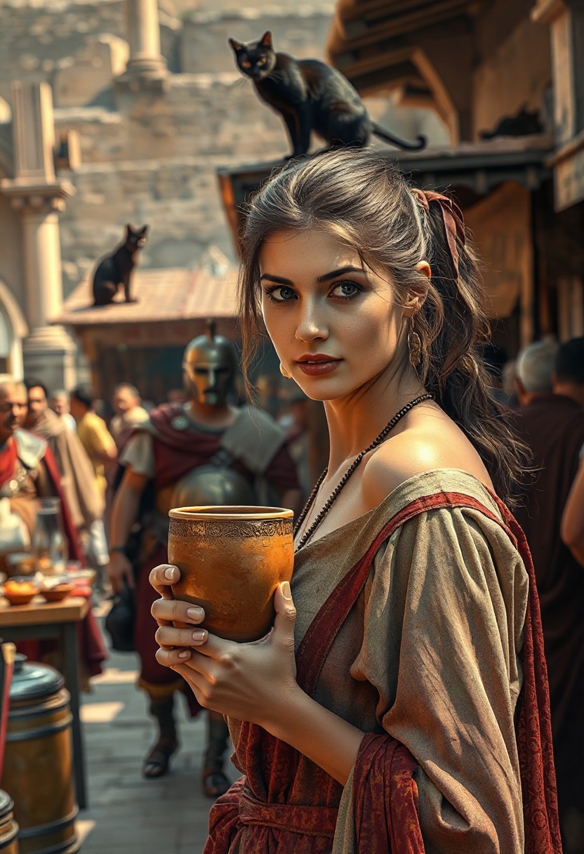 Setting is a 1st century Roman Empire market in Pompeii before Vesuvius destroyed it, the market is comprised of street vendors selling, food, weapons, and clothing. Everyone and everything in the image is appropriate for a scene from Ancient Rome, People wearing Roman clothing are walking through the street market shopping and eating, in the foreground is a merchant selling beverages and food at a market kiosk, (((a beautiful woman, 24 years old is standing in the foreground, the woman facing the viewer with a clay goblet of wine in her hand. Her eyes are beautiful and focused on the viewer, she has an expression of interested curiosity))), Roman Soldiers are walking behind the beautiful woman, one of the solders turns to look at the beautiful woman, many people are walking by in the busy street market, the woman is dressed in high fashion Roman Empire clothing with an alluringly sexual, but traditional roman aesthetic. The woman's hair is elegantly tied up with a ribbon. Artistic ancient Roman aesthetic, dynamic perspective, (((overall architectural aesthetic is Ancient Pompeii in 1st Century Roman Empire era))). Epic image that elicits a feeling of wonder and awe, a sleek black cat is visible sitting on a kiosk roof in the background,