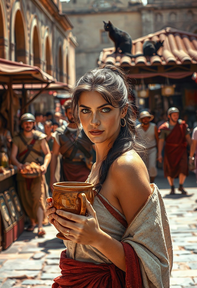 Setting is a 1st century Roman Empire market in Pompeii before Vesuvius destroyed it, the market is comprised of street vendors selling, food, weapons, and clothing. Everyone and everything in the image is appropriate for a scene from Ancient Rome, People wearing Roman clothing are walking through the street market shopping and eating, in the foreground is a merchant selling beverages and food at a market kiosk, (((a beautiful woman, 24 years old is standing in the foreground, the woman facing the viewer with a clay goblet of wine in her hand. Her eyes are beautiful and focused on the viewer, she has an expression of interested curiosity))), Roman Soldiers are walking behind the beautiful woman, one of the solders turns to look at the beautiful woman, many people are walking by in the busy street market, the woman is dressed in high fashion Roman Empire clothing with an alluringly sexual, but traditional roman aesthetic. The woman's hair is elegantly tied up with a ribbon. Artistic ancient Roman aesthetic, dynamic perspective, (((overall architectural aesthetic is Ancient Pompeii in 1st Century Roman Empire era))). Epic image that elicits a feeling of wonder and awe, a sleek black cat is visible sitting on a kiosk roof in the background,
