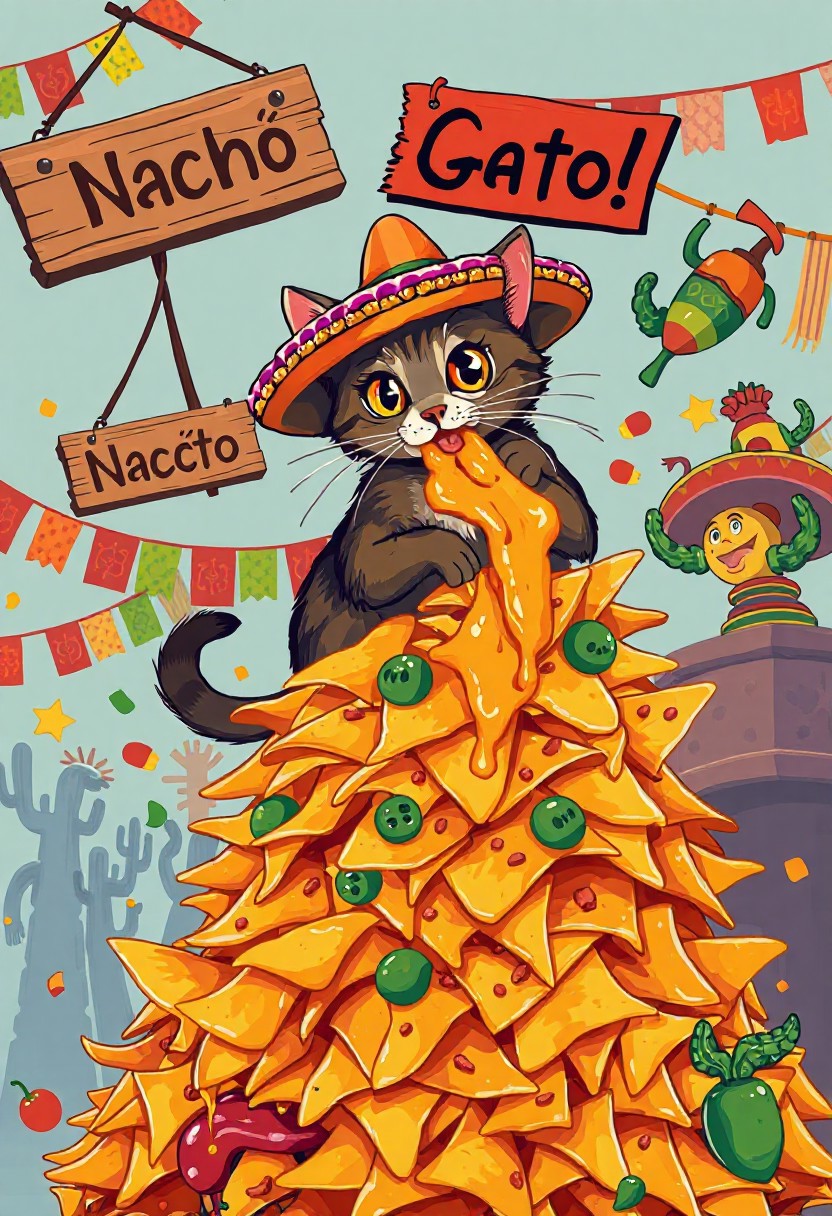 Vector flat Mexican style art Poster, A mischievous tabby cat wearing an oversized, brightly colored sombrero adorned with tiny chili pepper ornaments sits triumphantly atop a towering mountain of cheesy nachos. The chips buckle under neon-orange melted cheese that oozes like lava. The cat, with sparkling anime-style eyes the size of tortillas, swipes a nacho with dramatic flair, flinging cheese onto its whiskers in a gooey mess that stretches cartoonishly as it frantically licks it off. Behind the chaos, a vibrant Mexican fiesta bursts to life papel picado streamers flutter in reds, greens, and yellows, while googly-eyed piñatas shaped like cacti and mariachi figures dance and cheer. A hand-painted wooden sign reading “¡Nacho Gato!” swings crookedly above, caught in the festive whirlwind. Scattered below are salsa spills, a runaway jalapeño, and a toppled maraca. Rendered in a vivid Mexican folk-art style with bold outlines and Talavera-inspired patterns, the scene pops with fiery reds, sunny yellows, and deep azules—perfectly capturing the wildly whimsical spirit of a feline fiesta gone hilariously off the rails.