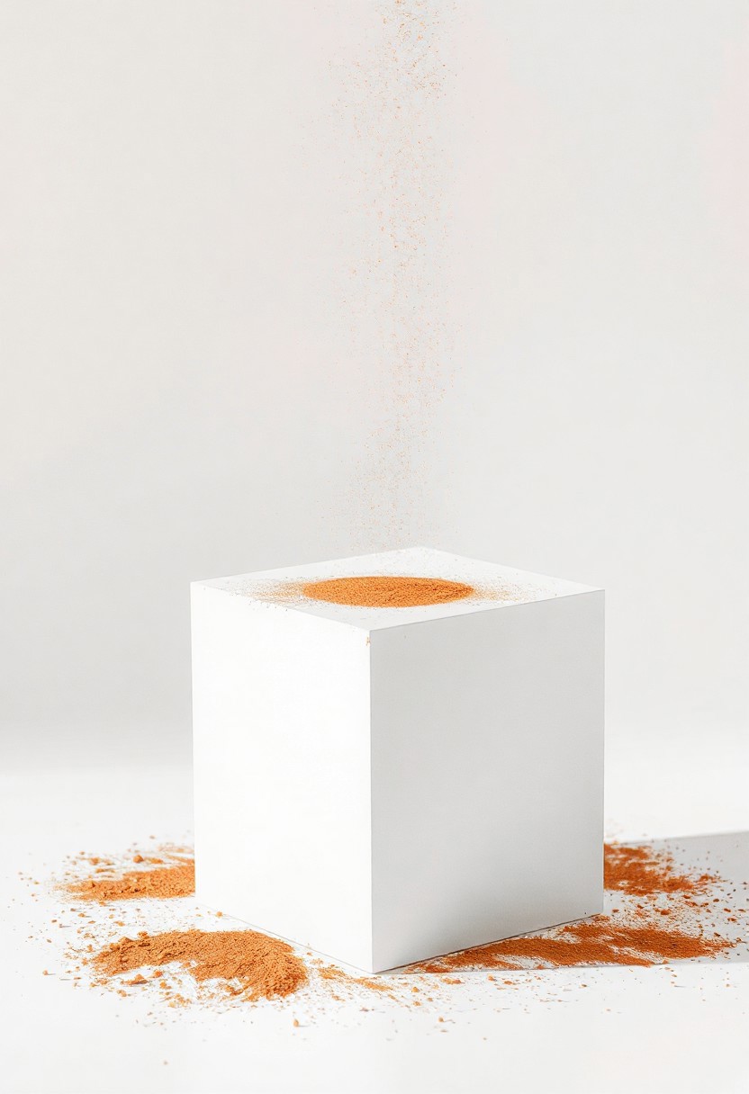 A white cube on a white background, bronze powder falling onto the cube, dramatic crisp light,