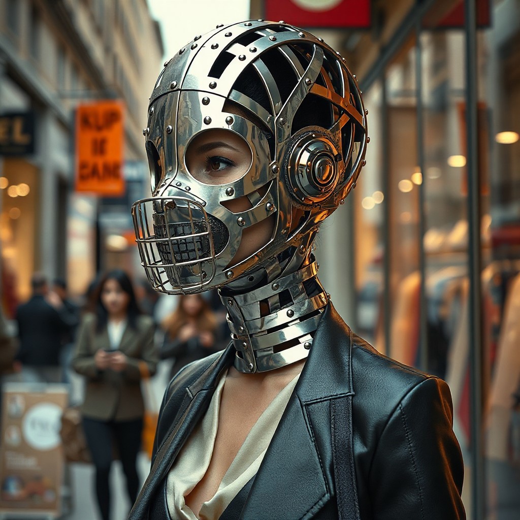 Full height view, a woman is wearing a close-fitting full face stainless steel head casing in the form of a female head made from an open framework of criss-cross strips of polished stainless steel riveted together, it fits closely to her head and neck and shoulders like a second skin fully enclosing head and face and neck and shoulders, the head casing, the head casing has two ornate eye holes and the steel neck casing is very elongated and there is a stainless steel grill muzzle covering her mouth (and she has a steel tethering ring through her nose:1.8), she is dressed in an elegant leather pencil skirt with high heels and a silk blouse and a fitted and tightly corseted jacket, she has a tiny and tight-laced waist, she is window-shopping on a busy street