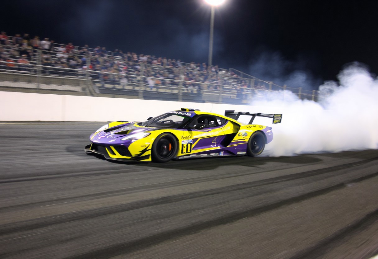 "This image portrays a race car in full motion on a track, with a cloud of smoke trailing behind it. The car's striking yellow and purple color scheme, along with black accents, creates a visually captivating appearance. The smoke adds a sense of speed and intensity to the scene. The well-lit track and the enthusiastic crowd in the stands contribute to the excitement and intensity of the race."