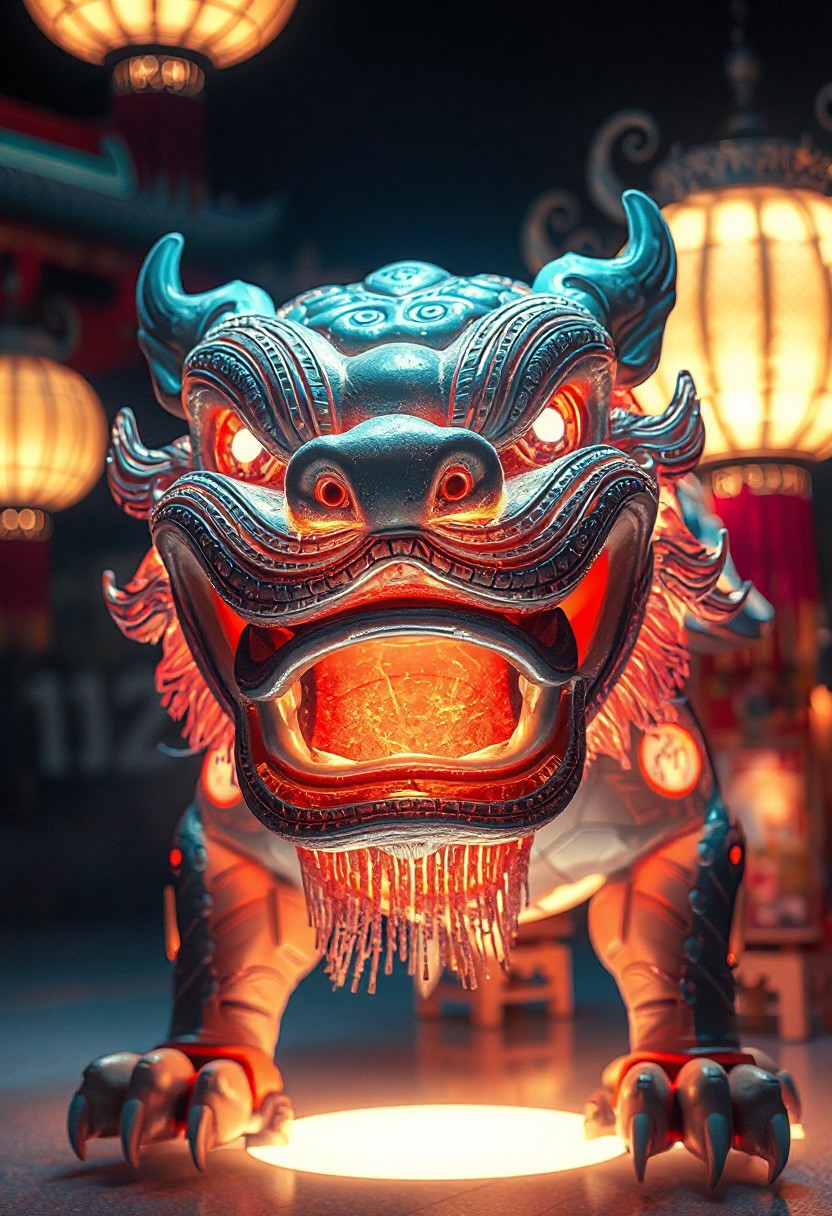 masterpiece, best quality, amazing quality, very aesthetic, high resolution, ultra-detailed, absurdres, newest, photorealistic details, volumetric lighting, foo dog with a spherical head and no body, large gapping maw, subsurface, glowing with inner light