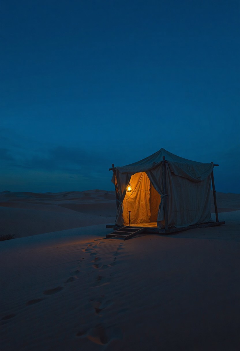A nostalgic 4K desert scene at golden hour — endless dunes bathed in deep blue twilight, soft mist hovering near the horizon. A weathered caravan stands still, its fabric gently fluttering in the breeze. Faint lantern light flickers inside, casting long shadows on the sand. Footprints trail off into the distance. The air is still, heavy with memories. Perfect for a slow dolly shot — cinematic framing, emotional atmosphere, deep focus, soft grain, One Heart style, ultra-detailed, warm and cool tones blending in harmony.