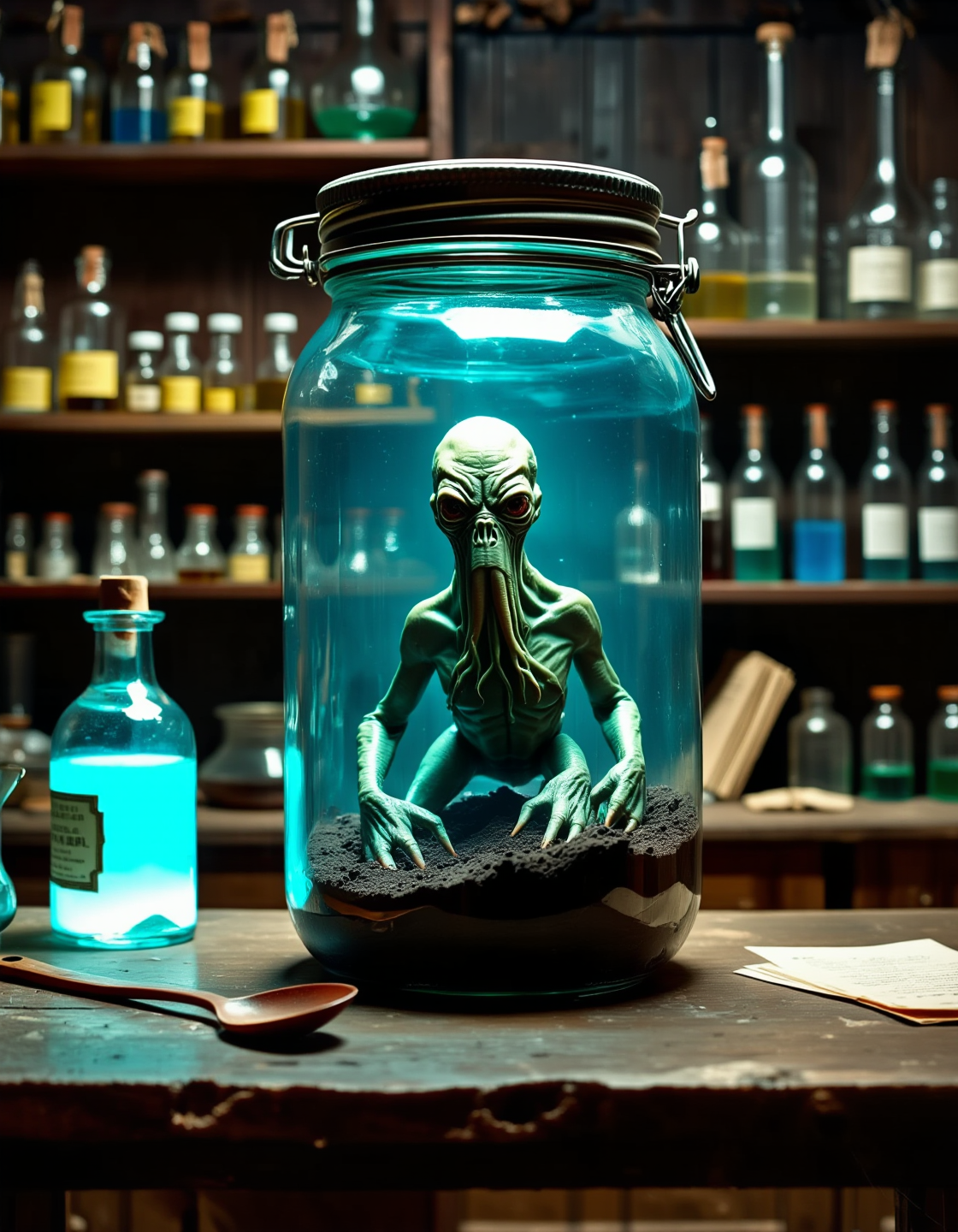 A high-resolution photograph featuring a surreal, horrific half-human squid hybrid cthulhu monster creature inside a large, glass jar with a metal lid and wire lock, the small but frightening and fierce creature contained inside the large glass jar resembles a [blocked word] squid hybrid with a human, the creatures looks like cthulhu, it has eyes like a squid, creature that has squid head and large, round eyes with unusual pupils, looking menacingly at the viewer. Small but frightening and fierce creature in the dark laboratory of a human mad scientist from 1955, orderly but full shelves line the walls with inscrutable tools and jars and test tubes filled with odd colored fluids and small alien objects. Jar of monsters in the foreground and lab space in the background. lum1, g0thicl1nes,cthulhu in a jar,