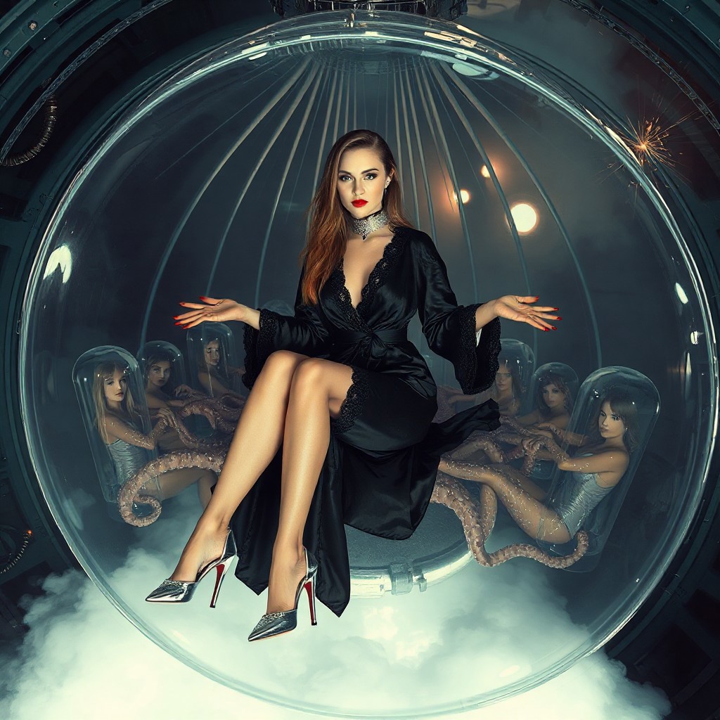 tall slender elegant slavic lady , sits in giant transparent (inverted jellyfish) laying at mirror disk bed, entangled in its tentacles, dressed in vintage long lace trim black satin dressing robe , spreading wide her pefect legs in high heels, surrounded by cocoons with encased beauties at background, sci-fi, scifi, mind control, silver slave collar, brainwash machine, breeding chamber, steel, foil, fog, hypno, romance, poison, lipstick, long hair, heavy makeup, 1950s hairstyle, red nails, long hair, green eyes, sharp cheekbones, ultra thin waist , mysterious, alien spaceship, space, radiating, laser, dramatic lighting, epic hollywood movie still, sharp focus, emitting diodes, smoke, artillery, sparks, horror, fashion look, hollywood, vogue makeup, porcelain skin, long haired, ultrathin waisym reminiscent of H.R. Giger, Zdzisław Beksinski, and Ash Thorp's dark, sleek styles, with close-up glamour photography, glossy satin and silver heels glistening, fleshy slime dripping, and dark shadows.