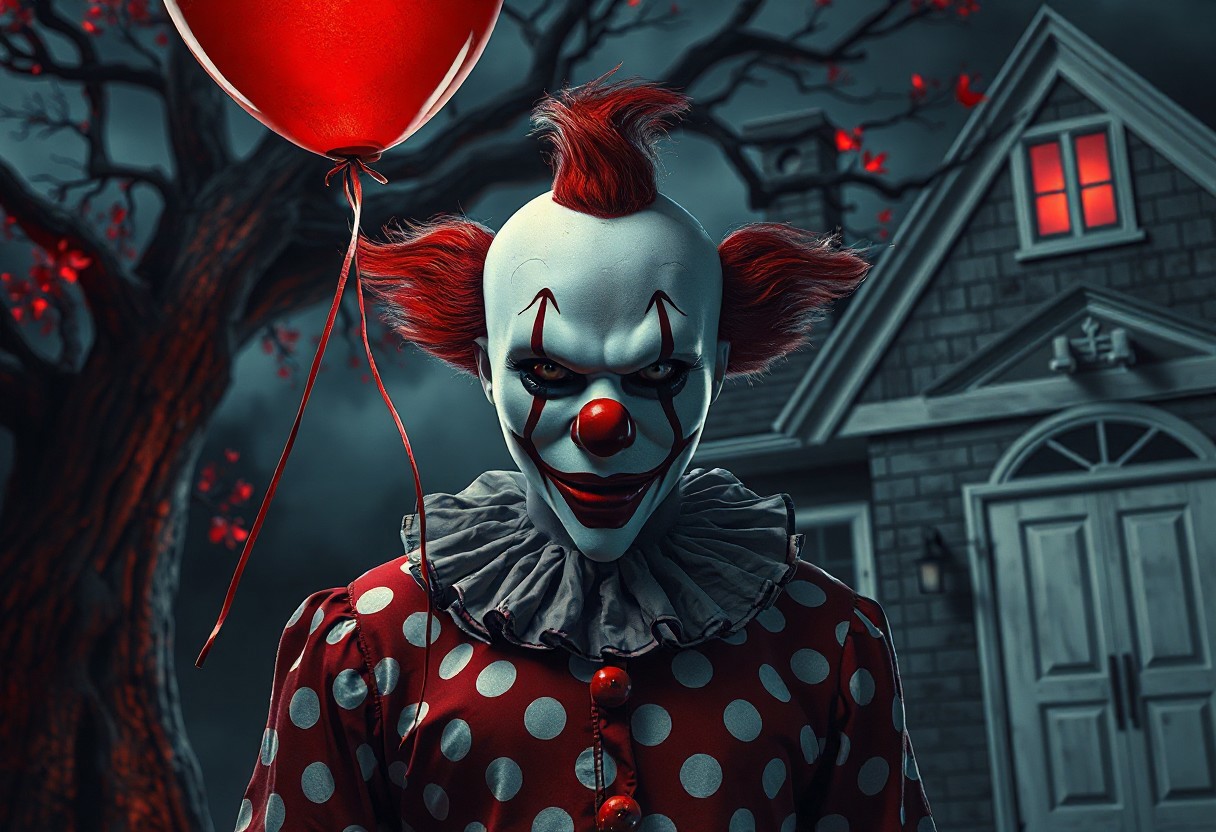 grimdark,dark fantasy,"Petren the Dark Clown stands center-frame, his white mask with crimson lips and nose glowing under dramatic stage lighting. The red-and-white polka dot shirt ripples slightly as he raises a crimson balloon, its string tangled with his shadow. Behind him, a twisted tree with glowing red leaves looms against a dark fantasy backdrop, while the house features a weathered gray roof and a pristine white door. Render in Unreal Engine 6 with splash ink textures, hyperrealistic skin tones, and sharp, intentional brush strokes. Capture the golden ratio composition, with Peten’s expressive, detailed eyes conveying both menace and whimsy. Include intricate mask patterns and a balanced foreground-background ratio, ensuring the clown’s figure dominates the scene while the balloon and tree add surreal depth."