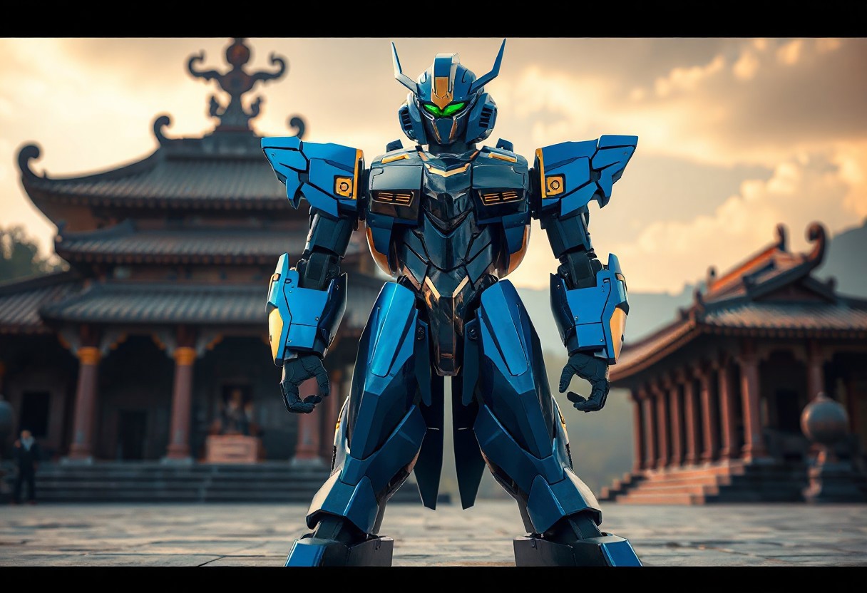 "The Ally of Justice Field Marshal robot stands tall and proud, its sleek blue and black body accented with gold, adding a touch of elegance. The head features a striking blue color with a prominent yellow visor, while the arms and legs are black with gold accents, creating a harmonious balance of colors. The robot is positioned on a temple surface, contrasting beautifully with the ancient Wedju Temple in the background, emphasizing its presence and strength. Rendered in 4K with lifelike details, the image captures the robot's design with stunning clarity. The lighting is cinematic, with a dynamic interplay of shadows and highlights, creating a captivating atmosphere. The composition is impeccable, with a focus on the robot's intricate details and the serene temple setting."
