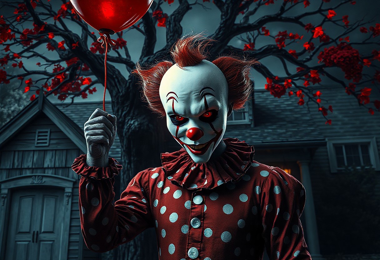 grimdark,dark fantasy,"Petren the Dark Clown stands center-frame, his white mask with crimson lips and nose glowing under dramatic stage lighting. The red-and-white polka dot shirt ripples slightly as he raises a crimson balloon, its string tangled with his shadow. Behind him, a twisted tree with glowing red leaves looms against a dark fantasy backdrop, while the house features a weathered gray roof and a pristine white door. Render in Unreal Engine 6 with splash ink textures, hyperrealistic skin tones, and sharp, intentional brush strokes. Capture the golden ratio composition, with Peten’s expressive, detailed eyes conveying both menace and whimsy. Include intricate mask patterns and a balanced foreground-background ratio, ensuring the clown’s figure dominates the scene while the balloon and tree add surreal depth."