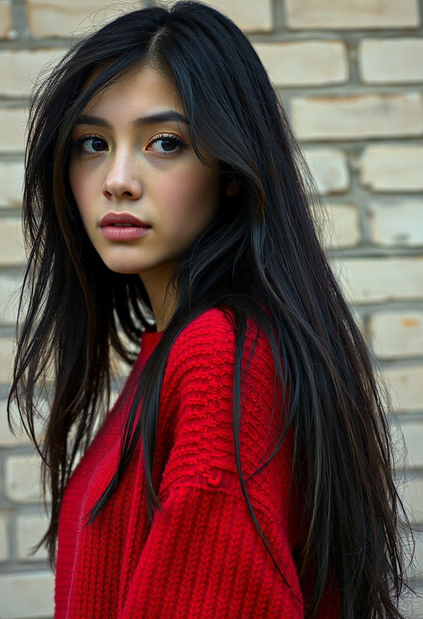 Create a photorealistic image depicting a young woman with long, flowing black hair. Her hair should have a slightly tousled and natural appearance, cascading over her shoulders and down her back. She is wearing a vibrant, solid red, oversized knit sweater with a crew neck. The sweater should appear soft and cozy, with visible texture in the knit. The lighting should be soft and diffused, avoiding harsh shadows, suggesting an overcast day or indoor lighting near a window. Her skin tone appears fair with a subtle, natural complexion. Her gaze is directed slightly off-camera to her right, with a contemplative or slightly surprised expression. Her lips are full and naturally shaped. The background should consist of a textured, light-colored brick wall with variations in tone and some subtle weathering or discoloration to add realism. The bricks should be arranged in a standard running bond pattern. The overall mood should be slightly melancholic yet serene, emphasizing the woman's natural beauty and the simplicity of her attire against the urban backdrop. Ensure the focus is sharp on the woman, with a shallow depth of field subtly blurring the background to draw attention to her. Pay close attention to the details of her hair, the texture of the sweater, and the subtle nuances of her facial expression to create a compelling and lifelike image.