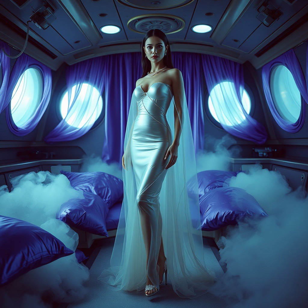 A poised and elegant slender lady, locked in a sleek, floor-length transparent slime dress, full skirt made of a giant glossy transparent jellyfish, complete with crystal-encrusted high heels, transparent slime cloak, is situated within a spaceship boudoir cabin, surrounded by weird foil purple pillows, fog from the floor, horror, soace, aliens, slime curtains, encased, entrapped Cinematic film still, shot on v-raptor XL, film grain, vignette, color graded, post-processed, cinematic lighting, 35mm film, live-action, best quality, atmospheric, a masterpiece, epic, stunning, dramatic