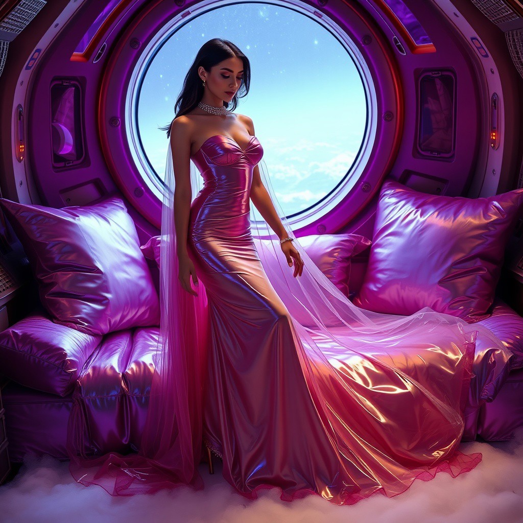 A poised and elegant slender lady, locked in a sleek, floor-length transparent slime dress, full skirt made of a giant glossy transparent jellyfish, complete with crystal-encrusted high heels, transparent slime cloak, is situated within a spaceship boudoir cabin, surrounded by weird foil purple pillows, fog from the floor, giant porthole