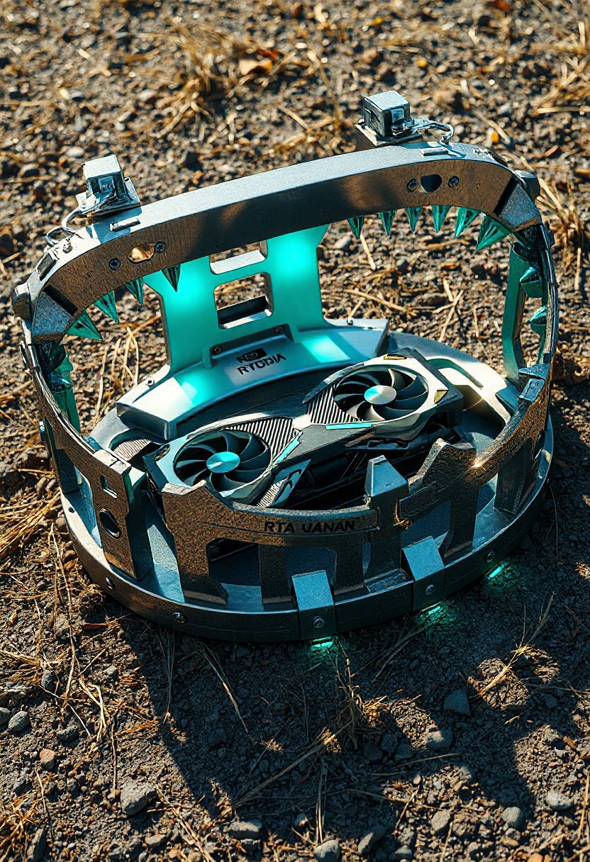 JNANX,luminous white silhouette,cyan glow,emerald highlights,flickering outline,dreamlike movement, "A visually striking digital artwork depicting a high-end NVIDIA RTX 4080 graphics card caught firmly within the jaws of a large, metallic bear trap. The trap is realistically rendered, showcasing its sharp, interlocking teeth and the sturdy metal base and levers. The graphics card, positioned centrally within the trap, displays its sleek design, including visible fans and branding details such as 'RTX 3080'. The scene is set outdoors on a textured ground that resembles dry grass and scattered pebbles, suggesting a natural environment juxtaposed with the manufactured object and trapping device. The lighting in the image is natural and casts subtle shadows, highlighting the three-dimensional form of both the trap and the graphics card. The overall mood of the artwork is one of irony and perhaps a commentary on the difficulty or 'trap-like' nature of acquiring such coveted hardware. The perspective is a slightly elevated angle, allowing for a clear view of the entire composition, emphasizing the vulnerability of the technology within the harsh mechanical grip of the trap. The color palette is predominantly muted grays and blacks for the trap and the surrounding ground, contrasting slightly with the silver and black of the graphics card.