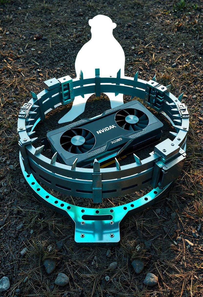 JNANX,luminous white silhouette,cyan glow,emerald highlights,flickering outline,dreamlike movement, "A visually striking digital artwork depicting a high-end NVIDIA RTX 4080 graphics card caught firmly within the jaws of a large, metallic bear trap. The trap is realistically rendered, showcasing its sharp, interlocking teeth and the sturdy metal base and levers. The graphics card, positioned centrally within the trap, displays its sleek design, including visible fans and branding details such as 'RTX 3080'. The scene is set outdoors on a textured ground that resembles dry grass and scattered pebbles, suggesting a natural environment juxtaposed with the manufactured object and trapping device. The lighting in the image is natural and casts subtle shadows, highlighting the three-dimensional form of both the trap and the graphics card. The overall mood of the artwork is one of irony and perhaps a commentary on the difficulty or 'trap-like' nature of acquiring such coveted hardware. The perspective is a slightly elevated angle, allowing for a clear view of the entire composition, emphasizing the vulnerability of the technology within the harsh mechanical grip of the trap. The color palette is predominantly muted grays and blacks for the trap and the surrounding ground, contrasting slightly with the silver and black of the graphics card.