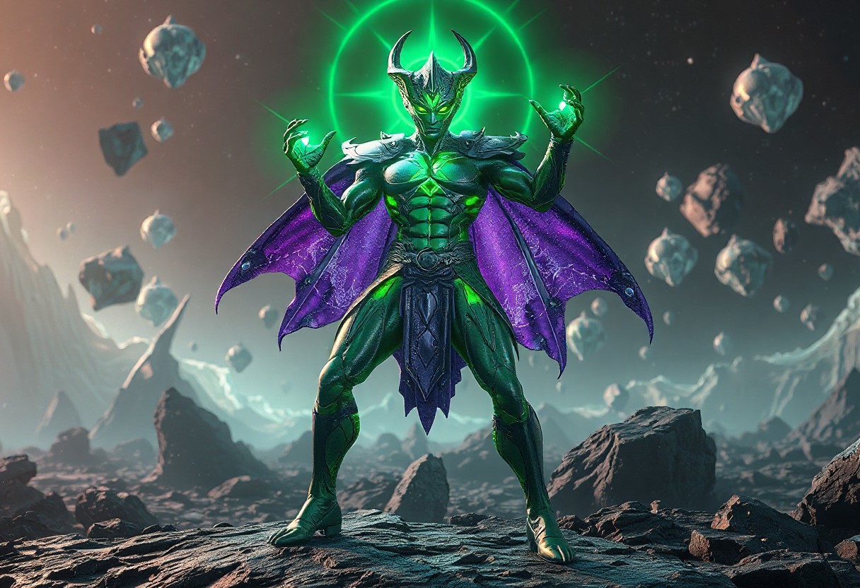 "8K UE5/Octane render of 'Holactie the Creator of Light'—a Marvel Comics-inspired figure in dynamic battle stance. Shimmering green/purple metallic skin reflects divine energy, standing on obsidian terrain amidst floating celestial rocks. The 'Divine Domain Baatistina' backdrop glows with ethereal light, contrasting his powerful form. Hyper-detailed nanite textures, Houdini FX energy aura, and ray-traced reflections. Post-processed with Kodak film grain and Grammer Effect color grading. Tags: #Marvel #DivineArt #ConceptArt."