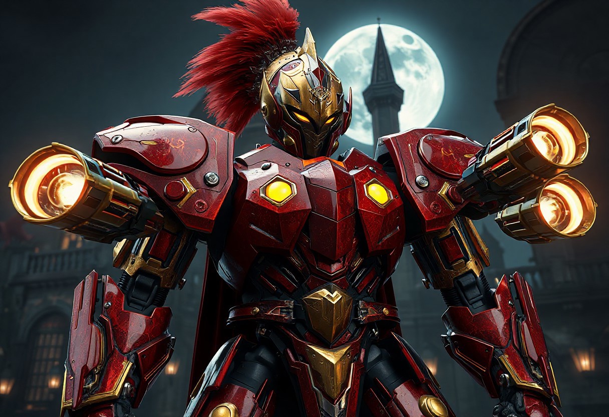 "8K UE5/Octane render of 'Mekk-Knight Yellow Star'—a crimson/gold battle-ready robot with dual arm cannons (large right/small left) and regal gold helmet with red plume. Poised before the gothic 'Mansion of Dreadful Dolls', its nanite-textured armor gleams under volumetric moonlight. Hyper-detailed Houdini FX (energy charging in cannons), ray-traced reflections on gold accents, and Grammer Effect color grading. Tags: #Mecha #DarkFantasy #ConceptArt."